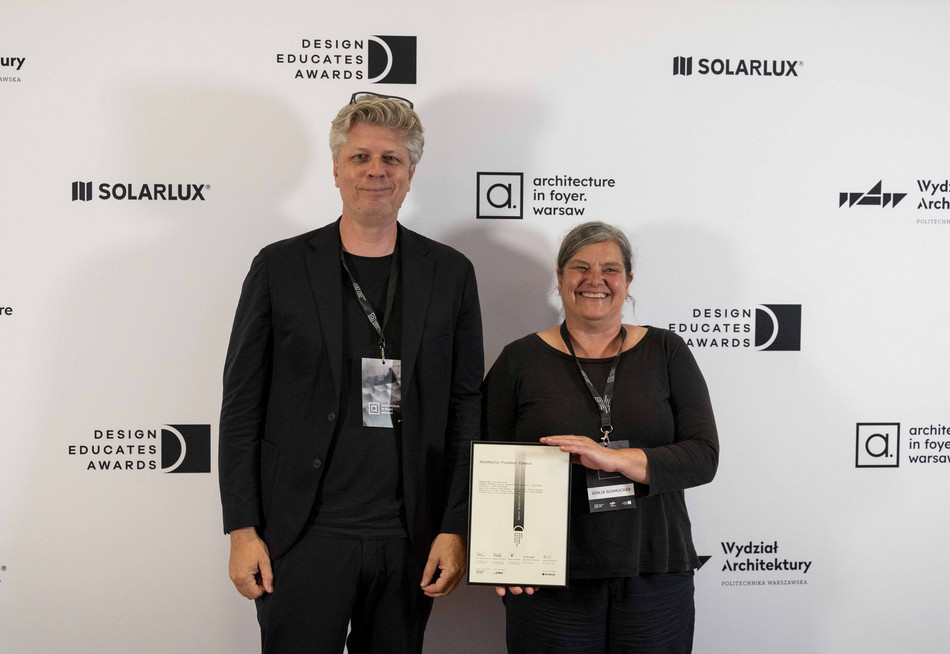 We are delighted to have received a »Special Recognition« at the Design Educates Awards 2025! Our project Helmholtz Pioneer Campus impressed the international jury headed by Toyo Itō. Launched in 2019, the awards are hosted by the Laka Foundation, a non-profit organization and a worldwide network focused on social impact via exceptional design and architecture. Steffen Vogt and Sonja Schmuker traveled to Warsaw for the award ceremony and accepted the certificate.