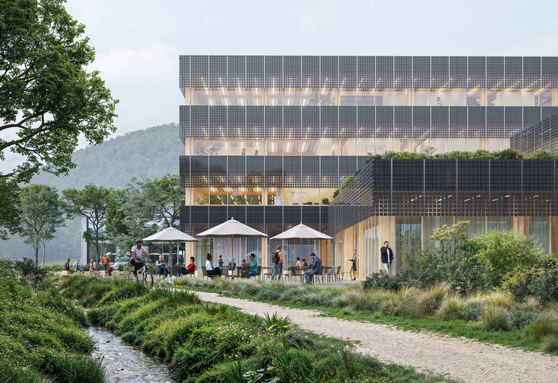 The building structure represents a modern, flexible laboratory landscape. Four laboratory usage units, each approx. 400 square meters, are arranged so that they connect to flexible office areas via skywalks. This allows both larger contiguous areas and the required individual rooms to be modified accordingly. The »Green House« invites you to learn, research, and linger, while providing relaxation and symbolizing the study of biology. In addition, it supports a natural ventilation concept for all areas that do not need to be mechanically ventilated. Its external appearance is characterized by the generosity of the flexible building structure and wood. Horizontally structured glass panels are divided by wooden parapet elements. Horizontally arranged ribbons of photovoltaic elements provide structural wood protection and, together with the photovoltaic elements on the roof, support the sustainable energy concept.