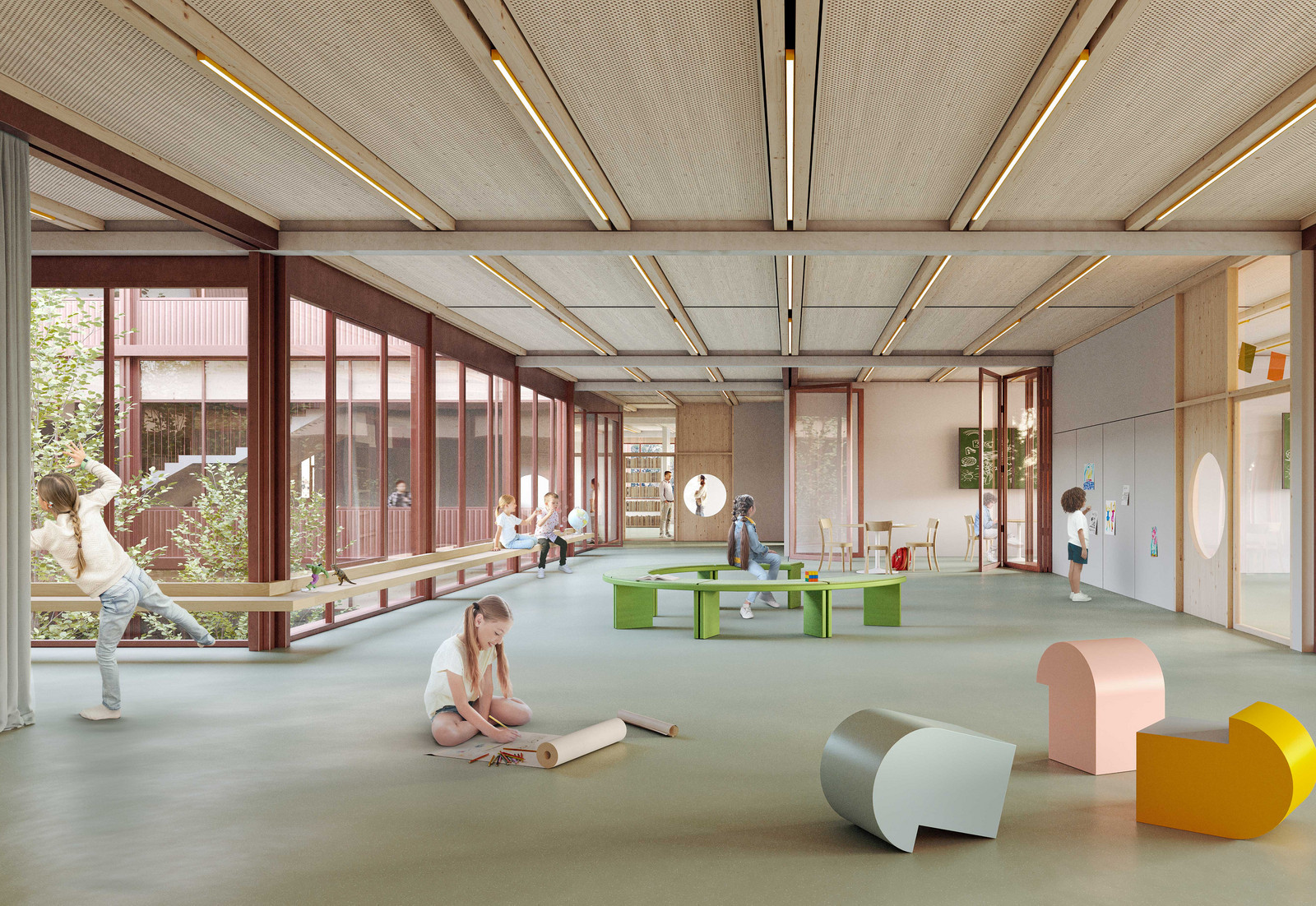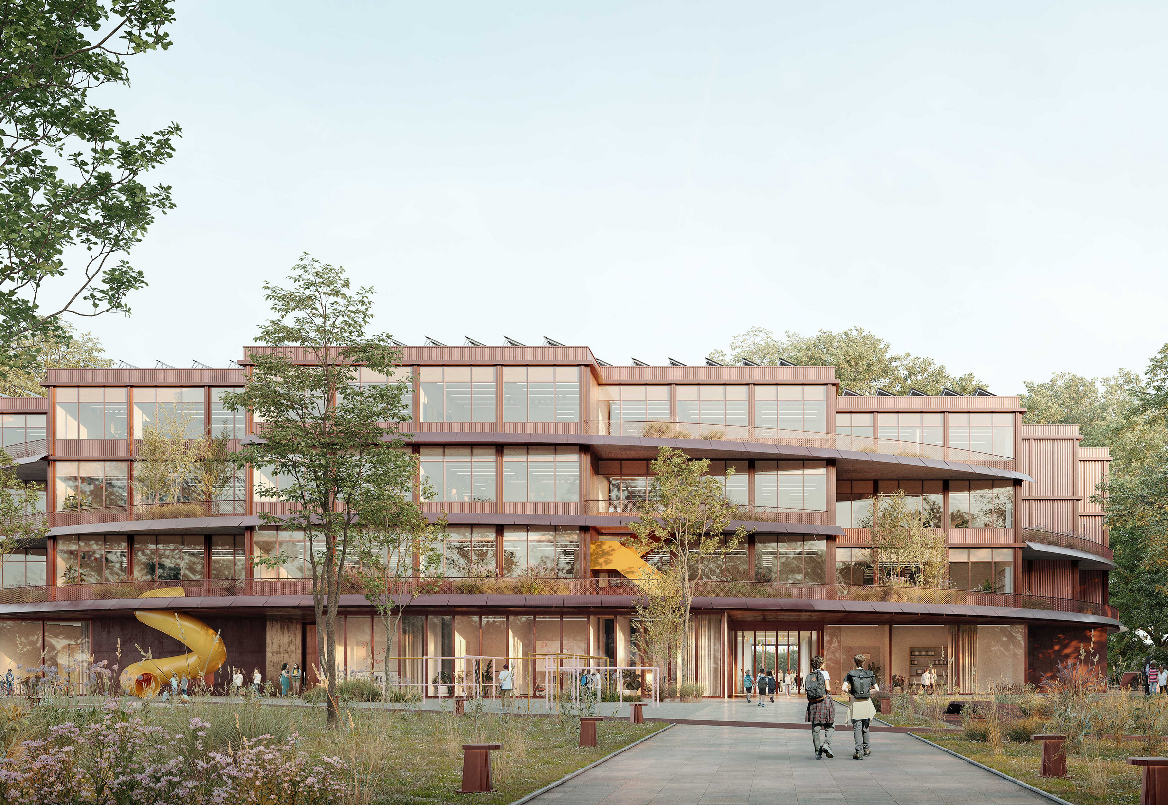 Zwei Erschließungswege gliedern das Gebäude im Inneren: in einen Sportteil mit der im Norden integrierten doppelten Dreifeldsporthalle und den im Süden konzentrierten allgemeinen Bereichen wie Mensa und Unterrichtsbereichen. Vom zentralen Eingangsfoyer, das durch zwei eingeschnittene Höfe mit Tageslicht versorgt wird, führen die Haupttreppen in die Obergeschosse. Hier sind jeweils drei Unterrichts-Cluster um ein Forum herum organisiert. Es entstehen einladende, vielfältig zonierte Bereiche für Kommunikation, gemeinschaftliches Arbeiten und konzentrierte Rückzugsphasen. Loggien, Einschnitte, PV-Gesimse und ein beweglicher, außenliegender Sonnenschutz erzeugen an der Fassade ein abwechslungsreiches Spiel aus Offenheit, Tiefe und Verschattung, unterstützt durch die intensive Begrünung der Terrassen. Die Wettbewerbs-Jury lobt ausdrücklich »die Verschneidung der runden Baukörperform mit dem orthogonalen Innenleben«. So entstehen wie selbstverständlich »Freibereiche, die an die Klassenräume angrenzen und den Übergang in den Naturraum definieren.«