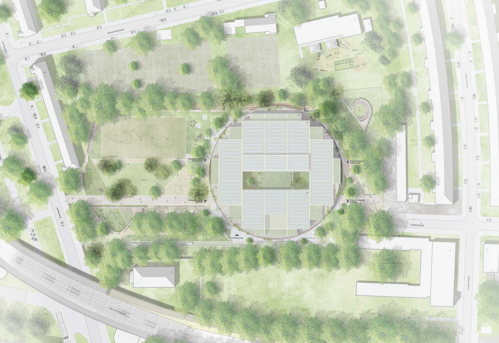 In unmittelbarer Nähe zur Siemensstadt sieht der Entwurf in Berlin-Spandau den Neubau der Gemeinschaftsschule Jungfernheide als kompakten, kreisförmigen Baukörper vor. Das Schulgebäude folgt in seiner Formgebung der früheren Nutzung des Geländes als Sportplatz. Durch die Platzierung können die Eingriffe in die Landschaft sowie in den Baumbestand auf ein Minimum reduziert werden. Die runde Typologie schafft zudem einen sichtbaren, identitätsstiftenden Impuls für die Transformation des Quartiers.