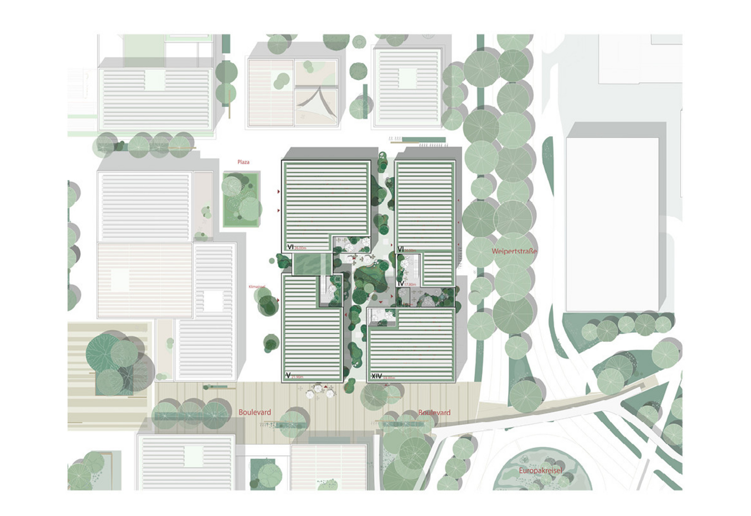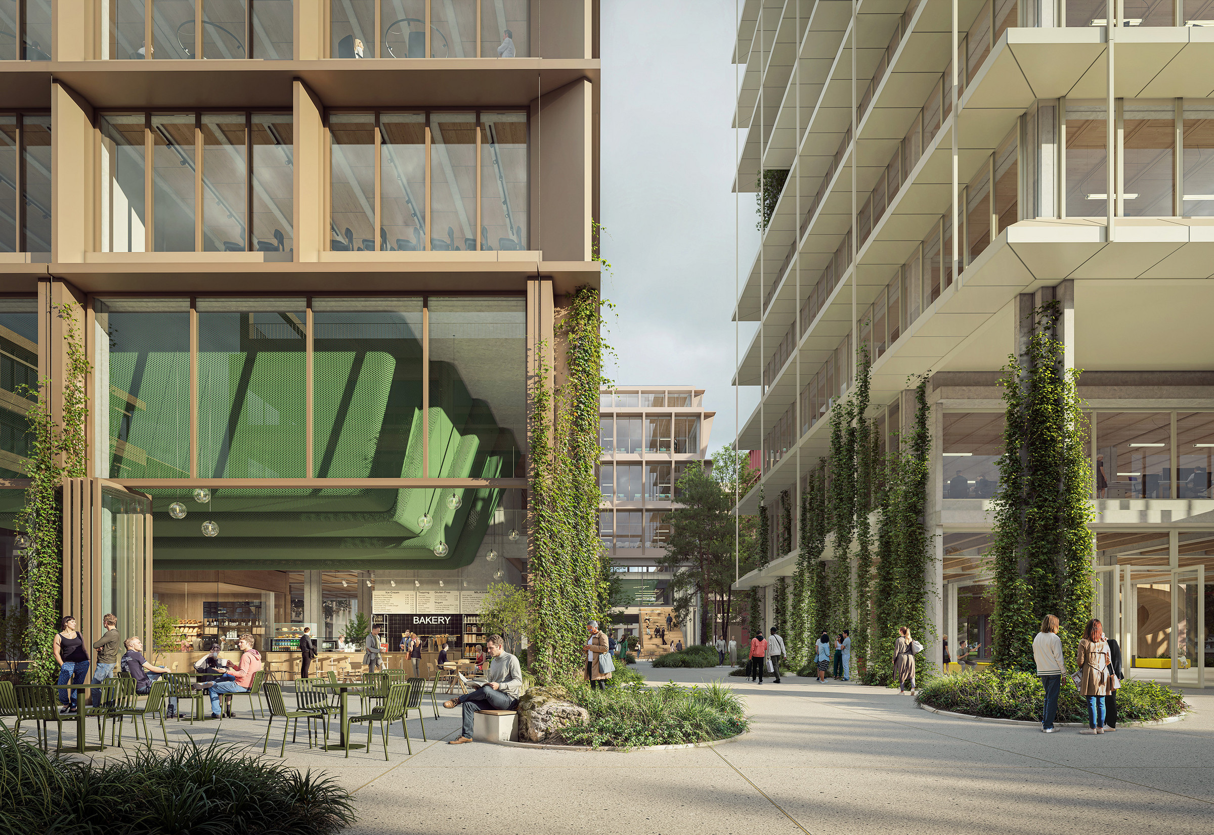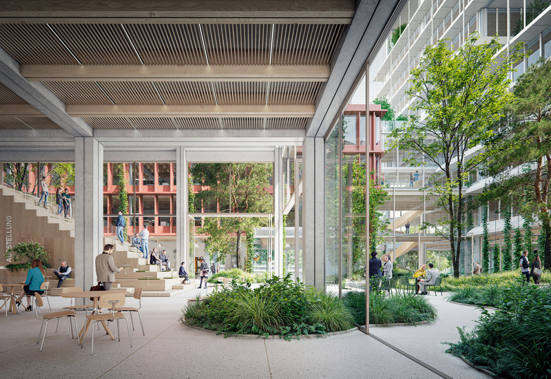 Das Projekt verbindet architektonische Qualität mit ökologischer, sozialer und wirtschaftlicher Nachhaltigkeit. Es ist auf langfristige Nutzungsvielfalt ausgelegt. Die modulare Holz-Hybrid-Tragstruktur ermöglicht unter Verwendung von Recyclingbeton Flexibilität, Anpassungsfähigkeit, wirtschaftliche Bauprozesse sowie spätere Wiederverwendungen. Das Nachhaltigkeitskonzept folgt einem Low-Tech-Ansatz ­– mit natürlicher Belüftung, Querlüftung, Nachtluftspülung, thermischen Speichermassen sowie integrierter Photovoltaik in Dach- und Fassadenelementen. Der Entwurf vereint einen vielfältigen und dennoch stimmigen Ausdruck und schafft ein einladendes und dynamisches architektonisches Ensemble, das eine lebendige akademische Gemeinschaft unterstützt. Die Architektur betont Offenheit und Transparenz und trägt maßgeblich zur Vitalität des Campus bei. Gemeinsam genutzte Atrien, Arbeitsbereiche sowie miteinander verbundene Vorlesungs- und Seminarbereiche fördern Kommunikation und Flexibilität.
