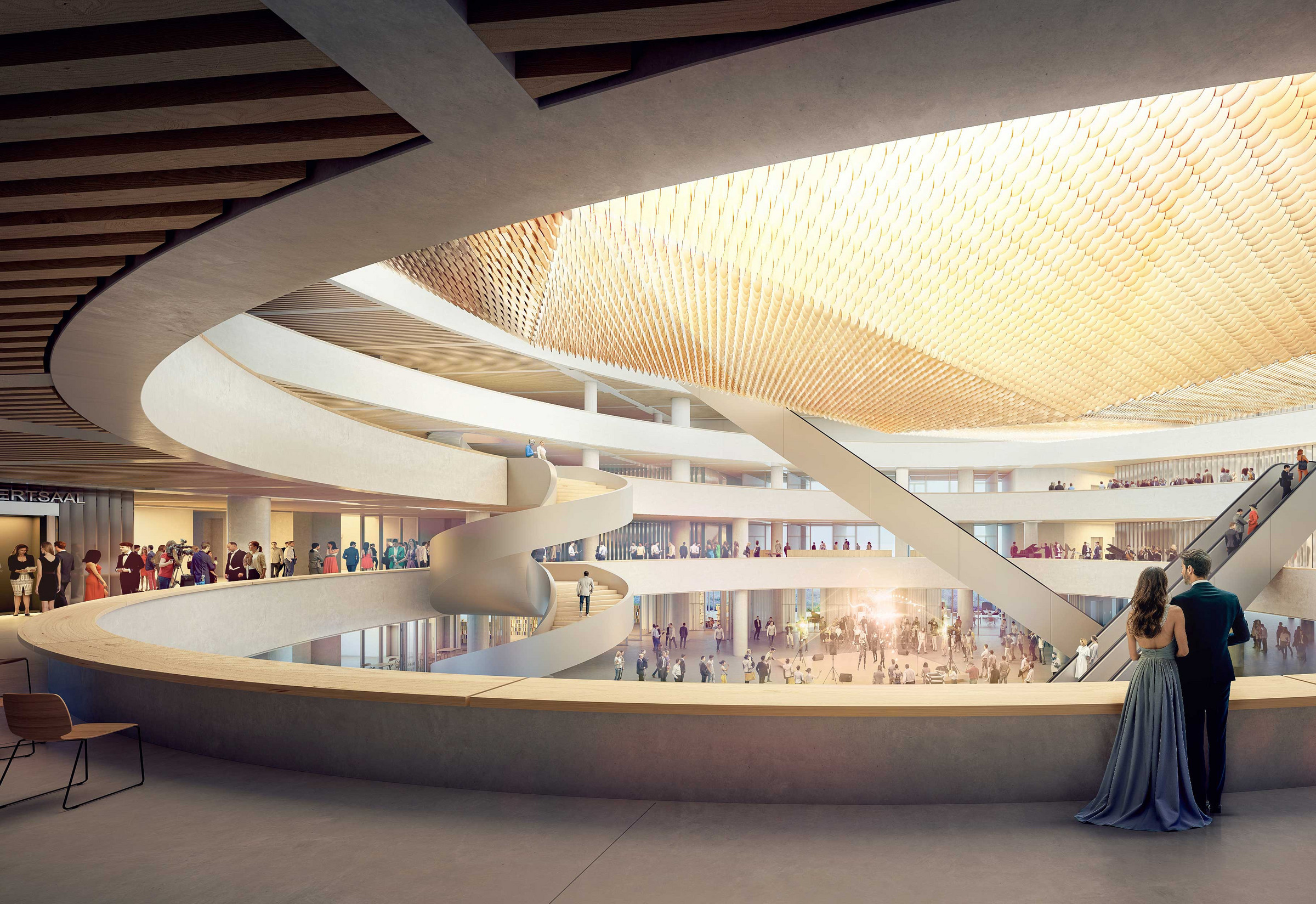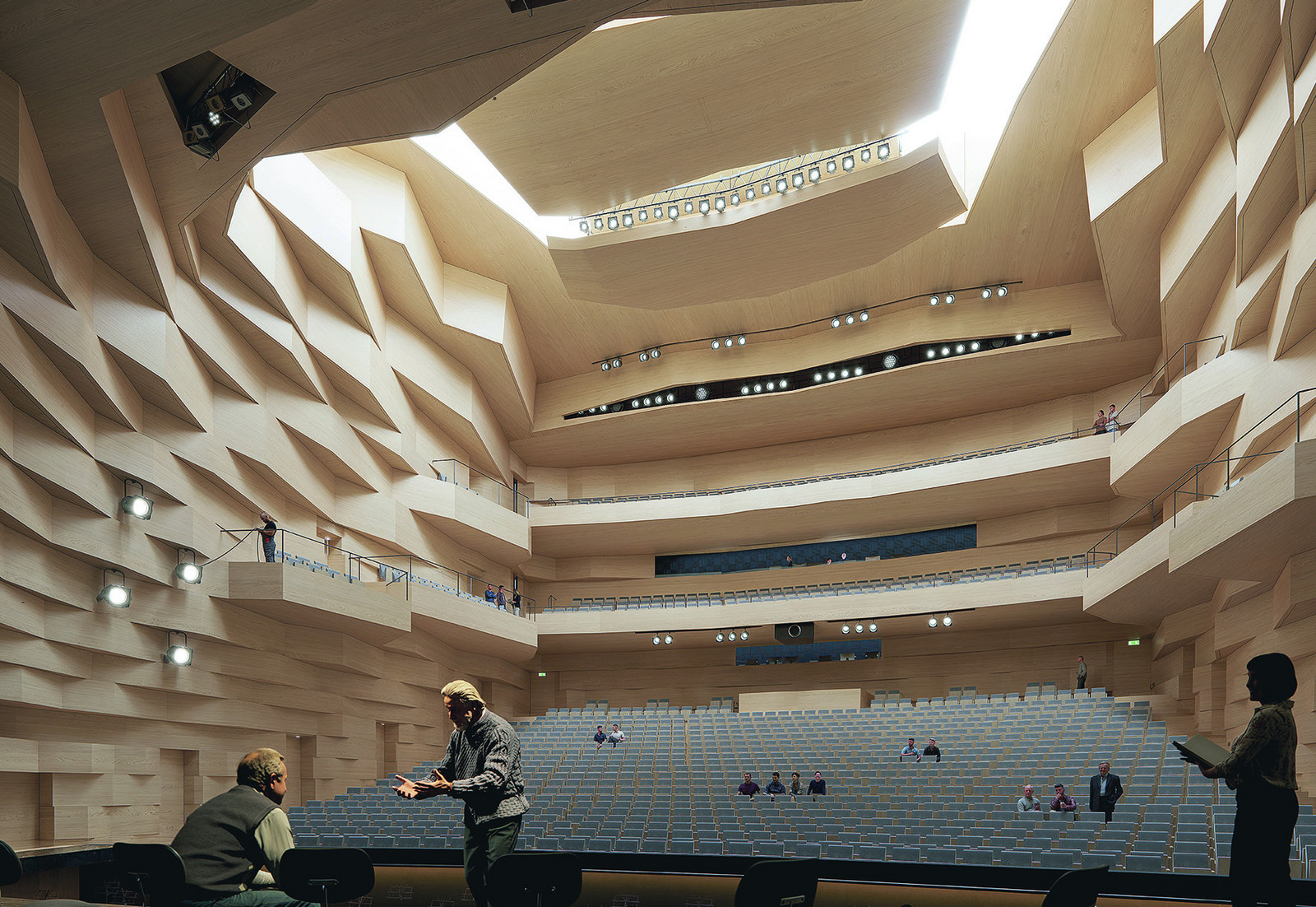 Die Fassade legt sich wie ein schillerndes Kleid schützend um das Foyer des großen Saals und die flankierenden Räume von Bibliothek, Musikschule und Forum. Sie spannt vielseitige Erschließungsräume auf und lässt das Gebäude zugleich leicht und lebendig erscheinen. An ausgewählten Stellen öffnet sich die Fassade und ermöglicht gezielte Ein- wie Ausblicke. Ein wesentliches Element ist die Integration transparenter und transluzenter Photovoltaikzellen. Sie erlauben eine nachhaltige, gebäudeintegrierte Energieproduktion und leisten einen aktiven Beitrag zur Klimabilanz. Der große Saal bildet das Herzstück der Oper. Seine Ausformung trägt dazu bei, Opernbesuchern ein exzellentes Hör- und Seherlebnis zu bescheren. Seine besondere Qualität liegt im Tageslichteinfall, der diesem Raum ein unverwechselbares Alleinstellungsmerkmal verleiht.