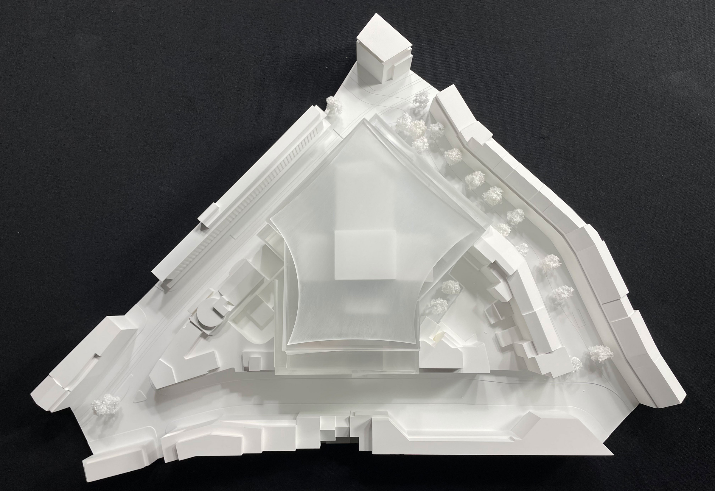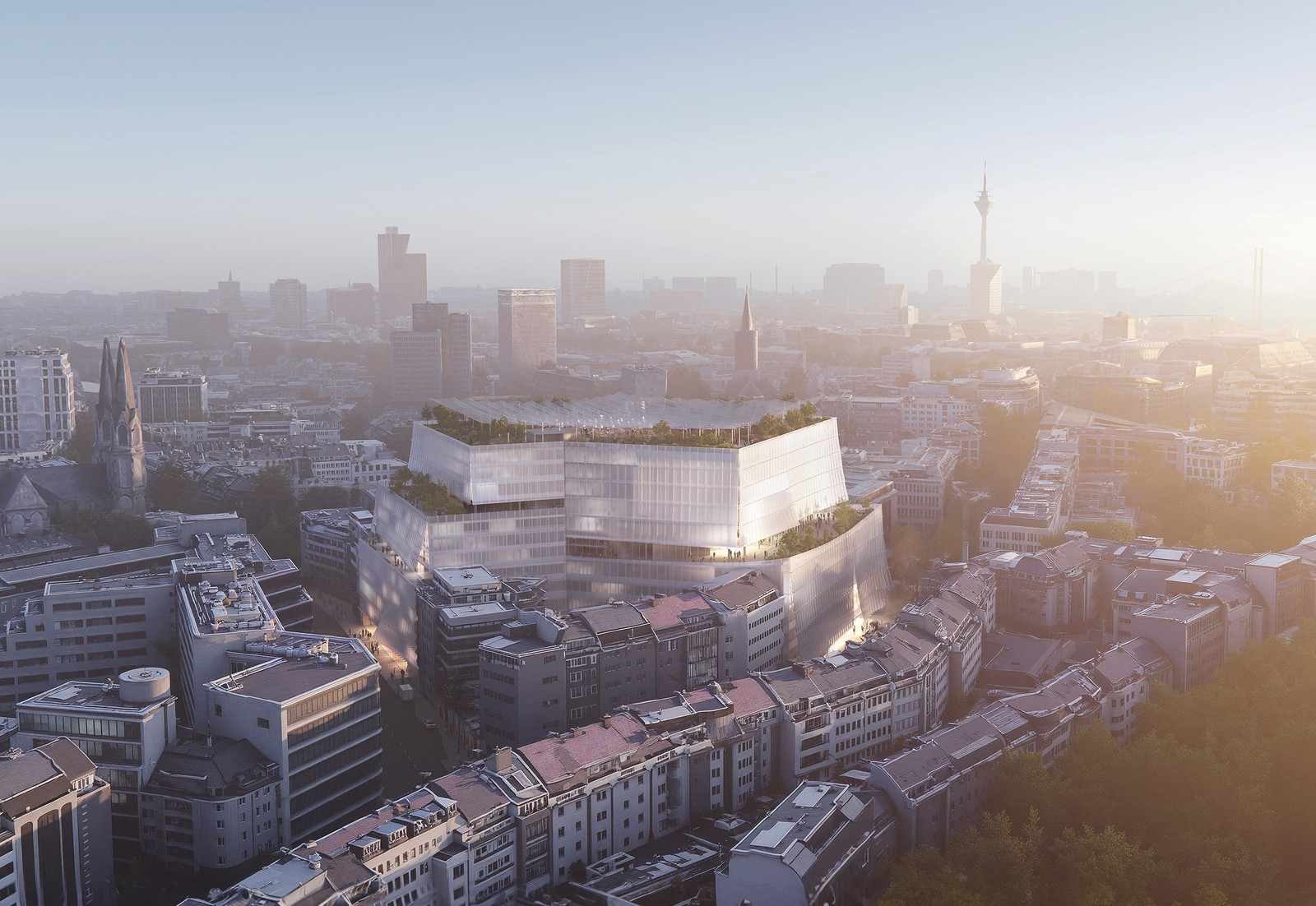 Die neue Oper Düsseldorf ist fest in das städtische Gefüge eingebunden – als Teil eines ganzen Stadtblocks. In unserem Entwurf schafft ein offener Durchgang im Erdgeschoss neue Wege und Verbindungen im Stadtraum. Das Forum öffnet sich in die Vertikale, eine öffentlich zugängliche Dachterrasse ermöglicht weite Ausblicke sowie ein gastronomisches Angebot für alle. Dabei entsteht die Gelegenheit, auf unaufdringliche Weise – bewusst oder beiläufig – mit kulturellem Inhalt in Kontakt zu treten.